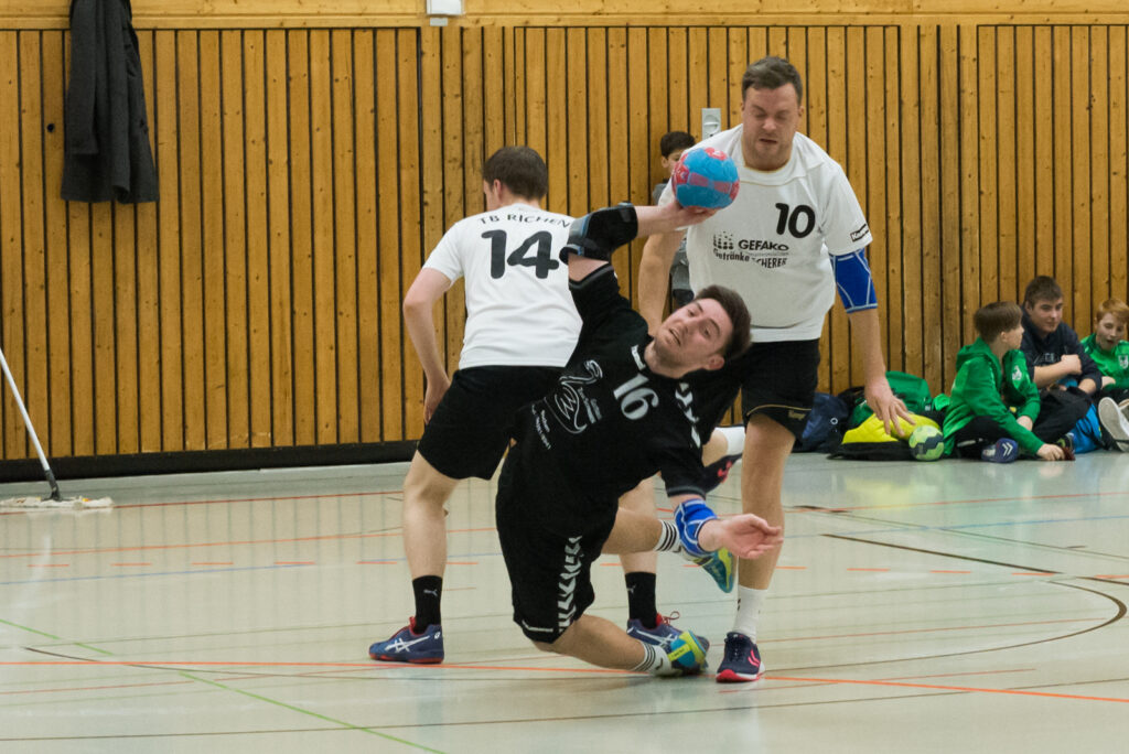 Doch die Partie in der Sport- und Spielhalle stellte alle Vorhersagen auf den Kopf. Das Team von Coach Sebastian Wiener zeigte sich exzellent eingestellt auf die Spielweise des Turnerbundes. Nach einigen Partien, in denen die Akteure die taktische Marschroute ihres Trainers nicht umsetzen konnte, war die Lethargie wie weggeblasen. Von Anfang an dominierte eine agile Abwehrreihe die Offensive der Gäste und ein sehr stark aufgelegter Goalie Fabian Nirmaier verriegelte den Buchener Kasten. Folgerichtig wies auch die Hallenuhr eine Buchener Dominanz aus – 8:1 nach zehn gespielten Minuten. Nur langsam kamen die Gäste in Fahrt. Erst nach über zwanzig Minuten leuchtete eine fünf von der Anzeigetafel, doch da war der TSV schon enteilt. Die Richener, die ohne ihre Etatmäßige Lebensversicherung Gottstein antreten mussten, fanden kaum Mittel und Wege zählbares im Spielberichtsbogen eintragen zu lassen und so ging es mit einem beinahe schon schmeichelhaften 15:8 in die Katakomben.
